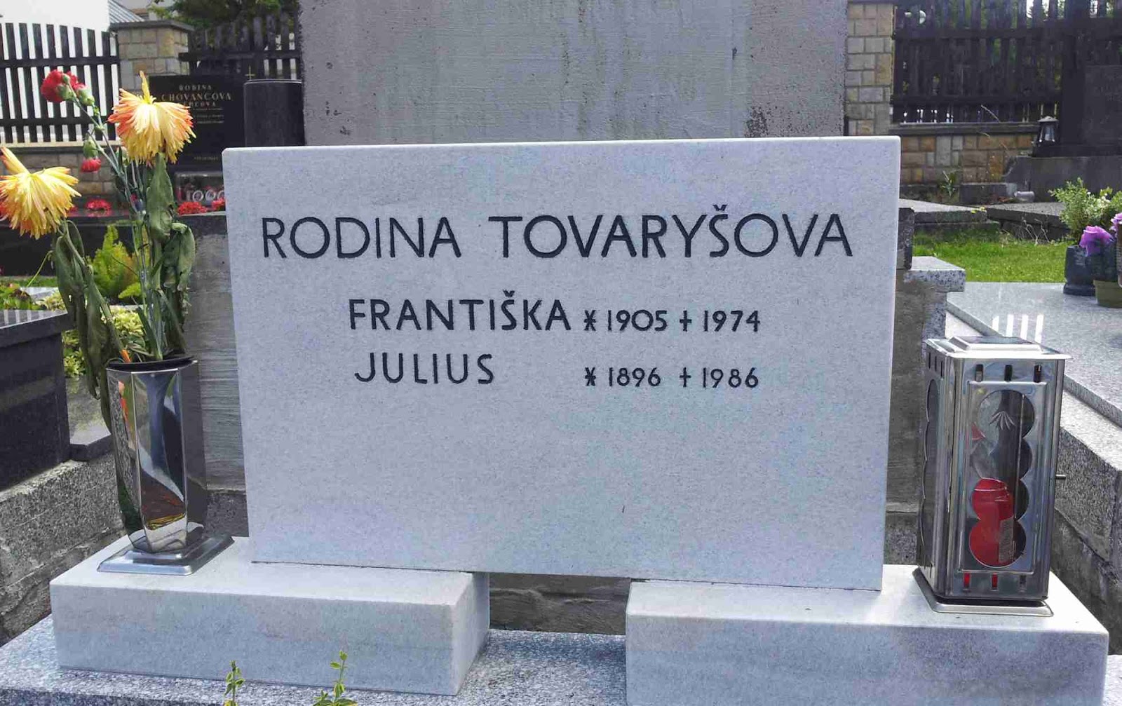 | Dědův strýc Julius Tovaryš byl patrně první Tovaryš, který se narodil na Horní Bečvě. Dožil se požehnaného věku. Zdroj: Vlastní foto z 1.7.2015, kdy jsem Horní Bečvu navštívil s mamkou a potomky Arnošta Červeného, k uctění 100 let od jeho smrti ve Velké válce. |